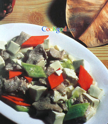 3、炒锅上火烧热,加适量底油,下入肉片煸炒至变色,放入葱、姜末爆香,再下入豆腐、胡萝卜片、黄瓜片翻炒,泼入“白芡汁”,熘拌均匀,淋明油,出锅装盘即可。