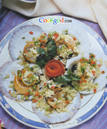 1、玉皇蘑去蒂洗净撕瓣;夏贝留壳,取净肉切片,分别焯水备用。