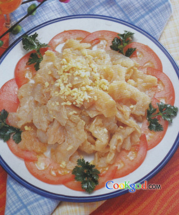 1、将蜇头用清水浸泡24小时(中间多次换水),捞出切成片,放入开水锅中烫一下,捞出放盘中。