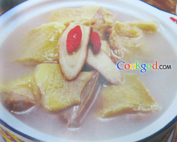 2、将净锅上火,放入清水、姜片、乳鸽、白芍、枸杞子,大火烧开转小火炖40分钟调味即成。