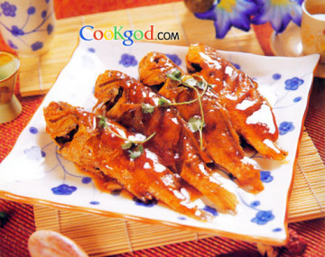 2.坐锅点火倒入油,油五六成热时放入黄花鱼炸至金黄色捞出,锅内留余油,倒入葱、姜、蒜煸炒,放入黄花鱼,加入醋、料酒、高汤、盐、糖、鸡精、酱油,烧15~20分钟;