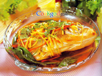 2、小火浸至断生即可放入碟中,在鱼身撒姜、葱丝,淋上热油及鱼汁即可。