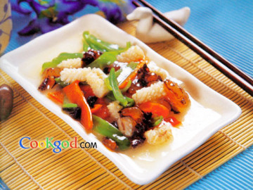 用料主料:鱿鱼、海蜇花辅料:青红辣椒调料:盐、葱、姜、胡椒粉、料酒、酪、食用油、淀粉