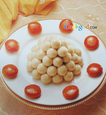 1、虾仁制蓉,加荸荠、番茄酱制成球形或红梅形,小火烧制红亮,备用。