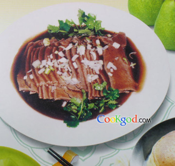 1、将牛肉入汤锅内煮至熟烂捞出。切成4厘米宽、8厘米长的大片,摆入盘内。