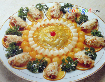 此菜使用多种烹饪技法,运用现代腌制手段,使菜肴的口感味型变换层次清晰,有贵妃出浴之意境。