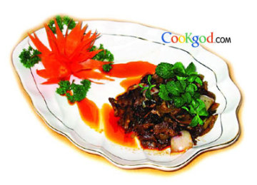 此菜香味扑鼻,色红亮,肉质微带干香,咸鲜略甜带辣,野薄荷色绿清香。