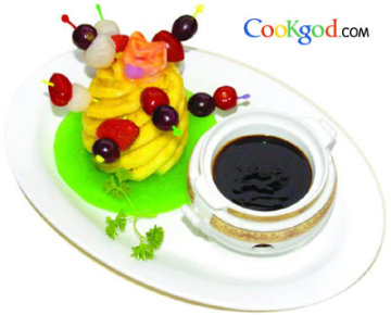 1、将水果串叉入菠萝上,将调好的巧克力酱放入明炉中,点火上桌;
