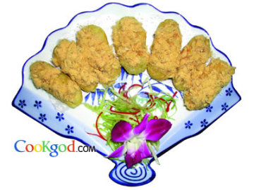 茄条炸好后粘上炼乳和肉松动作应快。