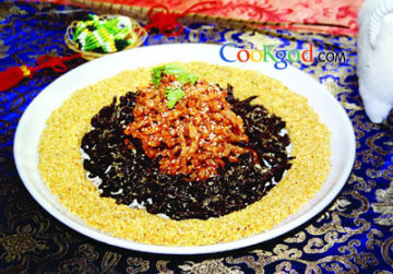 4、起锅八灶,锅内放白糖200克,水10克,熬出糖丝状,放八炒米离火翻炒均匀,装在盘子周围即成。
