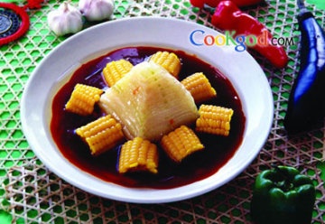 本菜根据北方盛行的“宝塔肉”改良而来。用冬瓜代替五花肉,用玉米棒子代替玉米饼,使这款菜肴更加清淡爽口,而且此菜也是粗料细作的一个典范。另外,在冬瓜内酿入羊肉丸子,也起到了荤素搭配的作用。