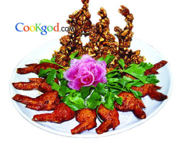 3、锅内放色拉油,大火烧至五成热时放鸡翅小火浸炸5分钟至枣红色,装在事先用核桃仁、糖浆粘成的假山的盘子里,成型即可。