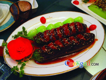 4、锅内放入色拉油,烧至五成热时将茄子放入(有馅的部分朝上)色拉油中,保持此油温小火浸炸8分钟,取出后控油,放入盘中(有馅心的一面朝上);油菜芯洗净后放入沸水中大火汆1分钟,摆放在茄子旁边。