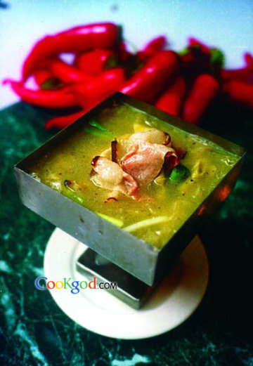 高原老腊肉、深山干竹笋各1000克,猪棒子骨、黄豆芽熬制的鲜汤5000克。调料精盐60克,酱油12克,醋20克,味精7克,姜米5克,蒜泥15克,煳辣椒面40克,花椒面8克,葱花20克。