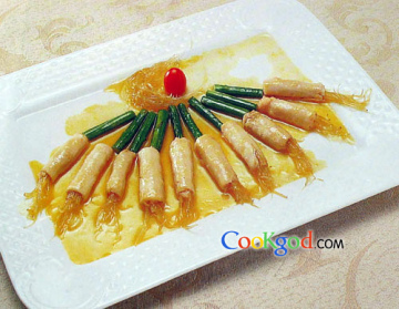 2、海虎翅治净,煨制入味,放入松茸菌内卷成筒状,入蒸箱蒸熟,与芦笋拼摆入盘。