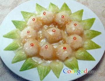 3、把浆好的虾肉过油后调味炒熟,装盘即成。