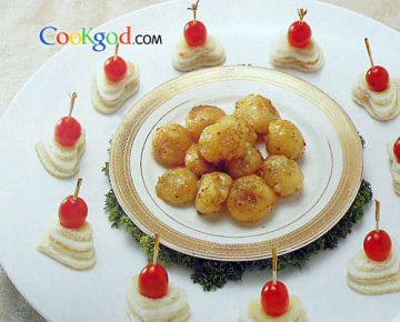 2、红毛丹取肉,填入制好的丸子,挂糊炸成球状,倒入蜜汁糖桂花中翻匀出锅,装入盘中间。