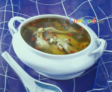 主料:光土母鸡1只750克,蛤蚧1对,党参25克,枸杞25克,火腿片50克,桂圆20克,姜片35克,葱结35克,清汤1000克