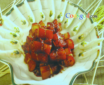 3、炒香姜葱,加入南乳、黄酒、清肠、盐、白糖、糖色和五花肉,用微火焖制熟烂,收汁勾芡,起锅摆在盘中间。