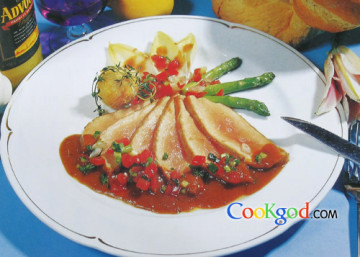 (6)将小牛肉批成片状装盆,配以各式蔬菜、土豆球,淋上蘑菇汁。