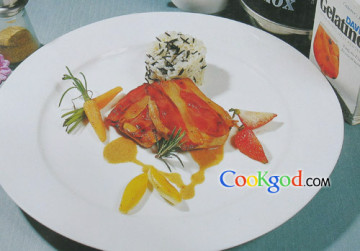(5)煎好的小牛肉装盆,配以各式蔬菜和野米饭,将(4)淋在牛肉旁,以草莓作装饰即可。