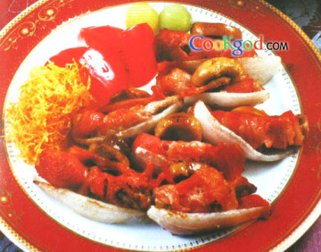 1、将鸡肉用元葱碎、西芹碎、俄力冈、盐、胡椒粉腌制后和胡萝卜、圆葱串成串备用。