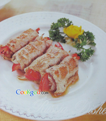 2、在羊肉薄片上抹上盐、胡椒粉,中间放上洋葱丝,番茄片卷成筒形,用不锈钢棒将羊肉筒逐一串起,放在炭火上随烤随翻转,并随时刷油至烤熟,趁热食用。