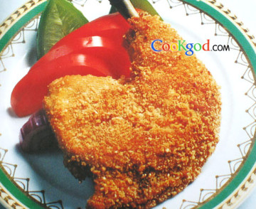 鸡肉切得适当厚些,用刀背剁一下,让肉质松软,调味料就根据个人口味调节,炸之前依次裹上淀粉,蛋液,面包渣,这样鸡肉水分流失不大,外壳又酥脆。