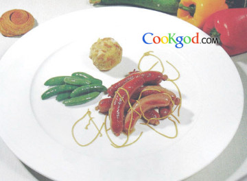 (4)将煎好的生牛肉肠装盆,以面包球、甜豆装饰。