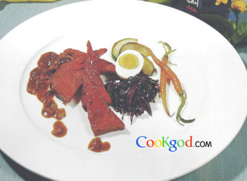 (5)肉包片装盆,鸡蛋煮熟后剖开,放在肉包片旁,用紫椰菜丝等装饰,淋入洋葱汁即可。