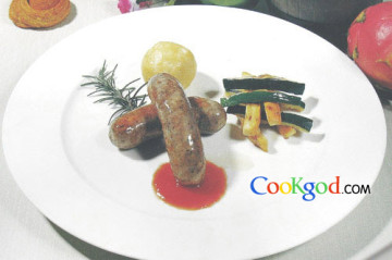 (4)将煎好的牛肉肠装盆,配以节瓜条、土豆球,淋入番茄汁即可。