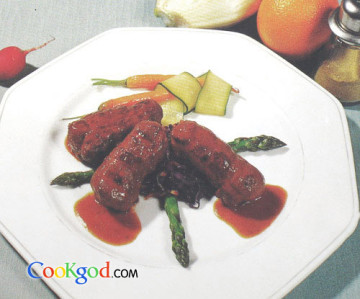 (4)取锅用黄油将洋葱末炒香,加红酒和黄汁,投入牛肉卷,煨烧至肉卷成熟。