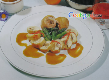 (6)拆掉鸡卷上的线绳,将鸡卷切成厚片,排叠在盆内,配上芦笋,淋上咖喱汁即可。