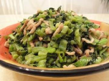 4. 油烧热,加入腌好的雪里蕻炒熟,再加炒好的肉丝炒匀即成(因为雪里蕻是咸的,无需加盐)