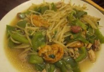 3。加入豆芽,青椒,腊肠,油面筋炒均匀至熟,放生抽,料酒,盐,糖,鸡精调味出锅装盘即可。