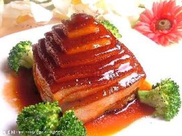 3、肉扣在盘中,用西兰花围边,原汁用生粉勾芡,淋在盘中,与荷叶饼一同上桌即可。