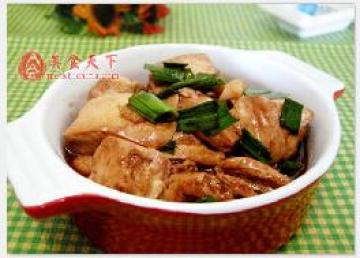 4、煮至汤汁收一半时倒入蒜叶,煮1分钟即可。如要豆腐更滋味,可用小许水淀粉勾芡,让汤汁把豆腐包裹起来。俗话说“千煮的豆腐万煮的鱼”,小火多煮,煮至汤汁即将收干即可,但不可因千煮万煮,煮出蜂窝豆腐或煮糊了。