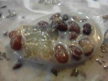 5、将红豆盛出来,根据个人口味,这个时候可以再加入适量冰糖。将焯好水的雪蛤倒在上面,入蒸锅蒸40分钟左右即可。
