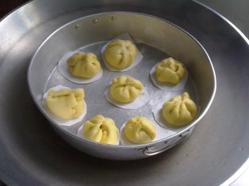 8。用擀面杖把圆形的面团压扁再包上馅料,每个包子底部放一张纸(以免包子贴在锅子里),然后放进锅子以大火蒸15分钟即可。