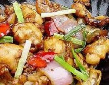 2、锅内放油,下入猪肉片、葱片、蒜片煸炒。烹入料酒,加入酱油、沙茶酱炒匀。下入田鸡,加汤烧开,至田鸡微熟,收浓汤汁。