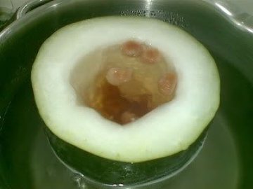 1.冬瓜中间留下种子挖空后的空位,把干龙眼肉,冰糖放进冬瓜里