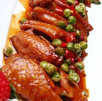 4、 锅内留底油,放入葱、姜、辣椒,煸香放入炸好的鸡翅加陈皮、冰糖、开水炖5分钟,加青豆、枸杞再炖1分钟即可出锅摆盘。