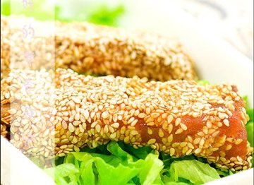 3、碗里倒入白芝麻,把腌制好的肉排放在白芝麻上滚一滚,使肉排均匀沾上白芝麻。