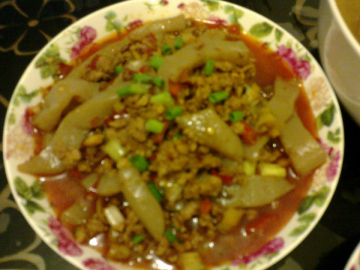 老板娘家祖传叉烧肉(外一种)、酱汁烧土豆、南瓜蛋炸辣肉、长豆炖土豆