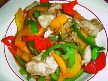 三椒不可炒得太久,恐软,颜色也就不好看了。