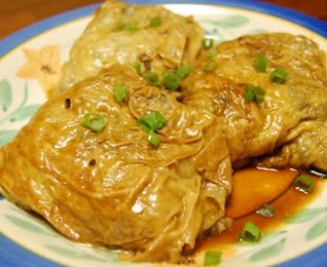 3.锅里放少许油,将豆付衣包两面略煎一下,再加半杯水,酱油,和一小勺糖,煮7-8分钟.
