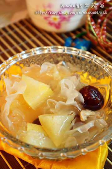 雪耳2小朵、雪梨1个、瘦肉50g、红枣5颗、姜2片