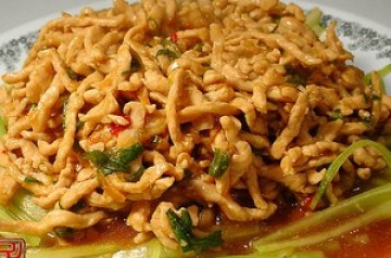 锅留底油, 将调味料烹熟, 滑入肉丝, 颠锅.淋上香油, 勺出肉丝, 盛在垫铺了黄瓜丝的盘中即可.