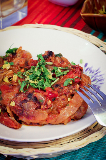 4. 加1罐头番茄块(我用的新鲜番茄+番茄酱代替)和2/3杯盒装牛肉汤,盐和胡椒调味,继续加盖小火焖1个半小时。中间要不时用铲子把汤汁浇到肉扒上。肉和筋都要酥软香嫩,但是不能散烂。