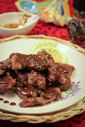 rib meat,盐,香料(我用的蒜味的综合香料)和很少一点点橄榄油,盒装鸡汤,日本芥末,一片柠檬,干香菜碎,适量糖。